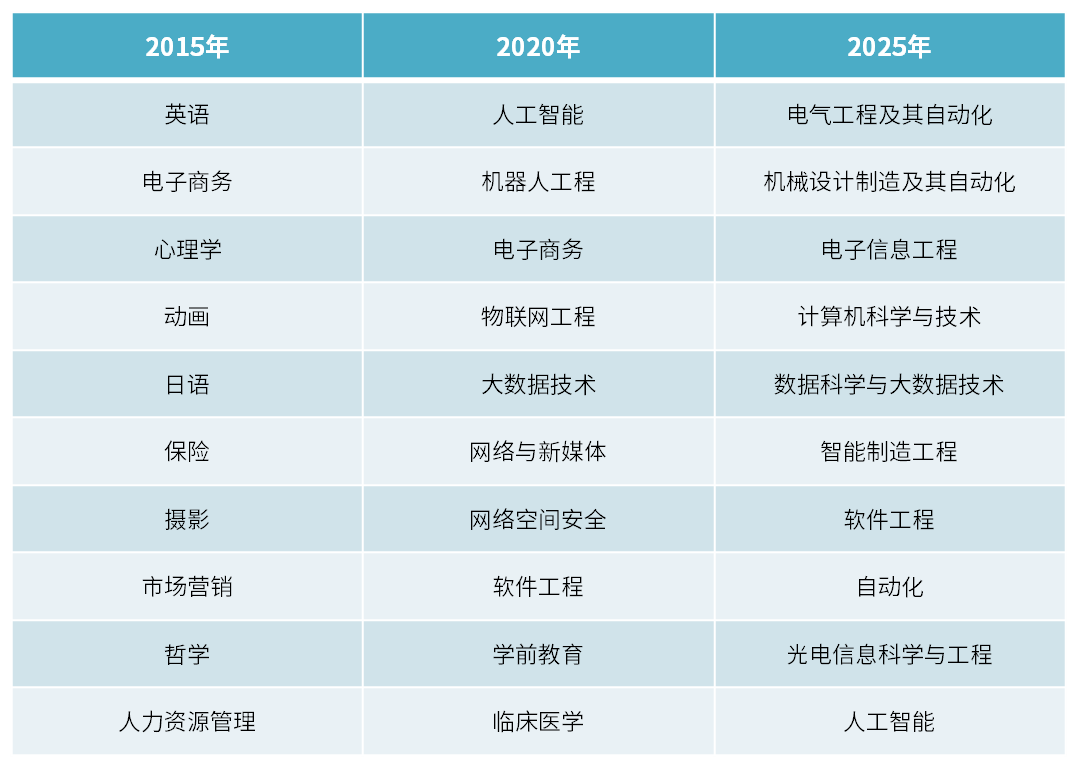 到了2020年,工学专业已占领榜单的半壁山河,包罗人工智能、机械人工程、物联网工程等工学或理学专业被泛博考生及其家长所关心,但也有电子商务、收集取新、学前教育、临床医学等非理工类专业较为抢手。