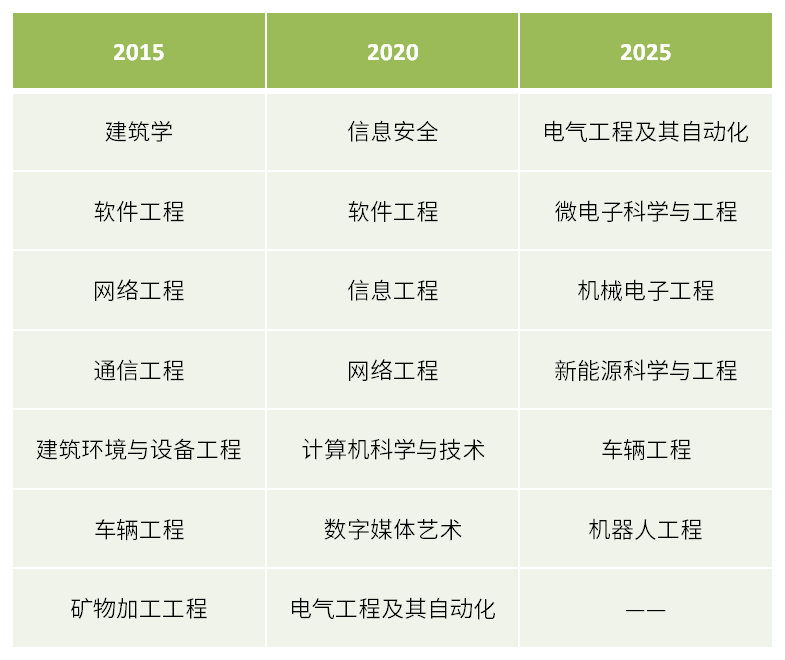按照麦可思研究院的数据来看,近十年间的绿牌专业(绿牌指的是就业对劲度高的需求增加型专业)根基均为工科专业,但具体的专业标的目的有些微妙的变化。